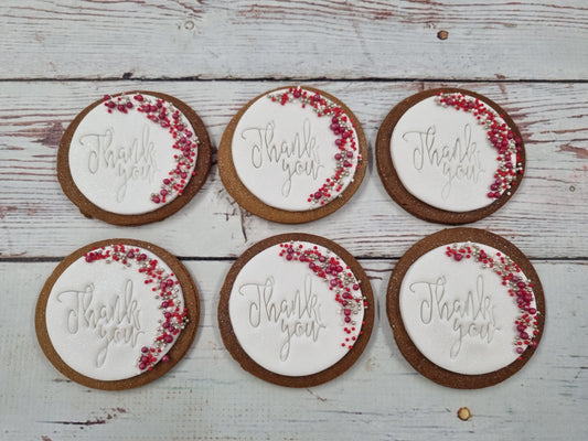 Our classic gingerbread cookies just got a glow-up! Each one is handmade with love and topped with vanilla fondant, a custom message, and a touch of bling ✨