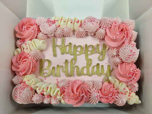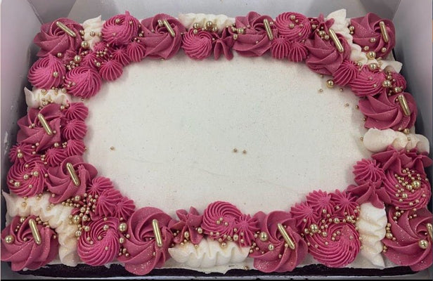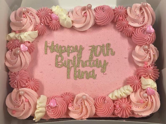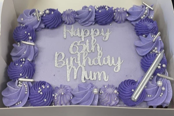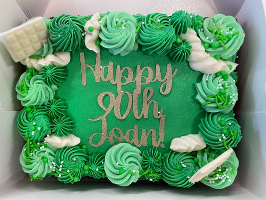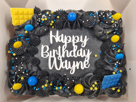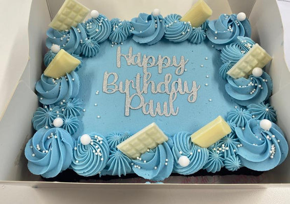 A decadent chocolate cake topped with piped buttercream and decorations in the colour theme of your choice! Perfect for birthdays, celebrations, or just because 🎉