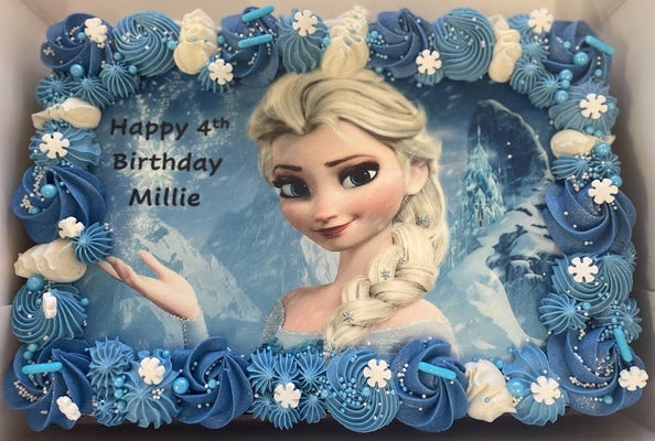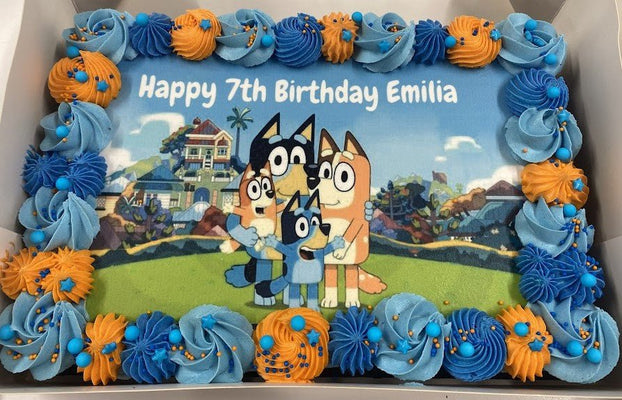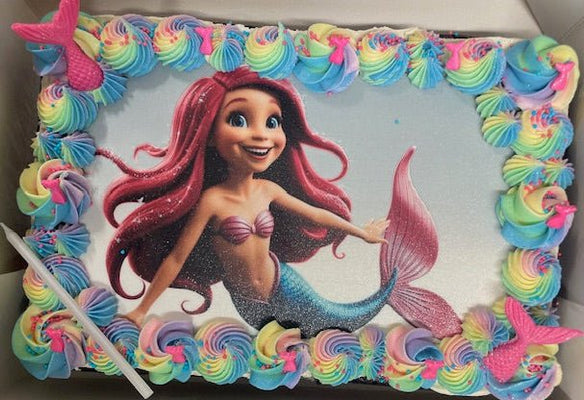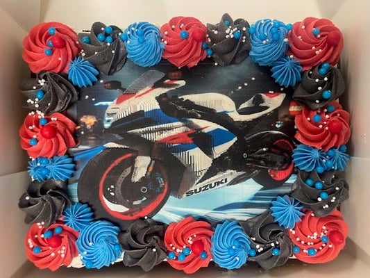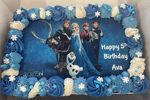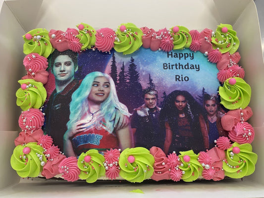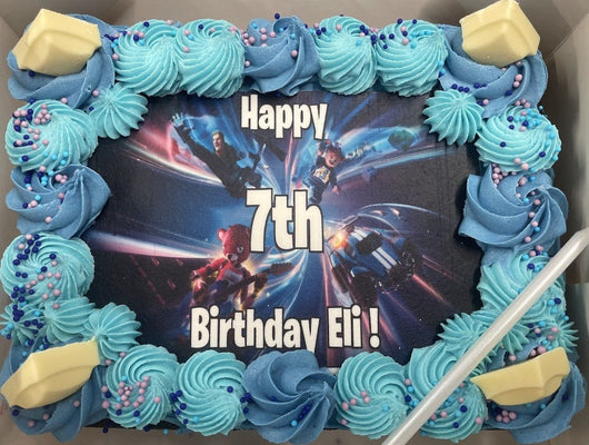 Our Cake in a Box Cakes are a decadent chocolate cake topped with piped buttercream and an edible image of your choice!