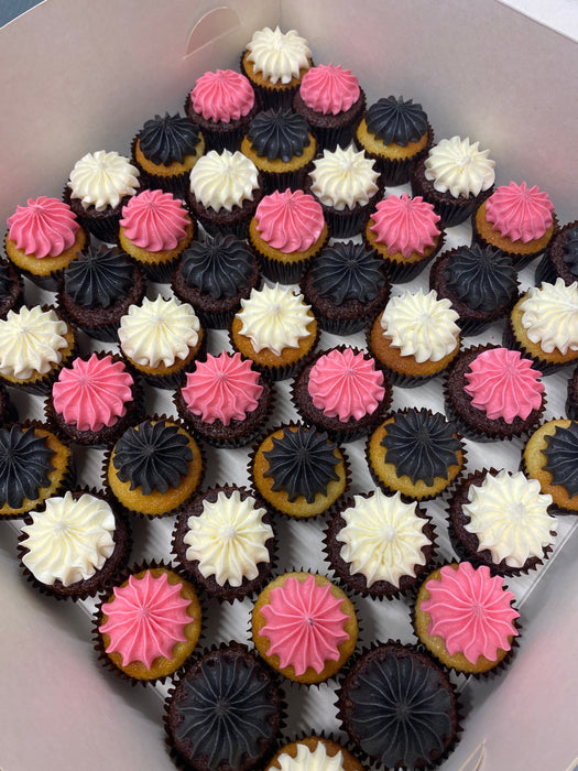 Each box includes a mix of vanilla and chocolate mini cupcakes.