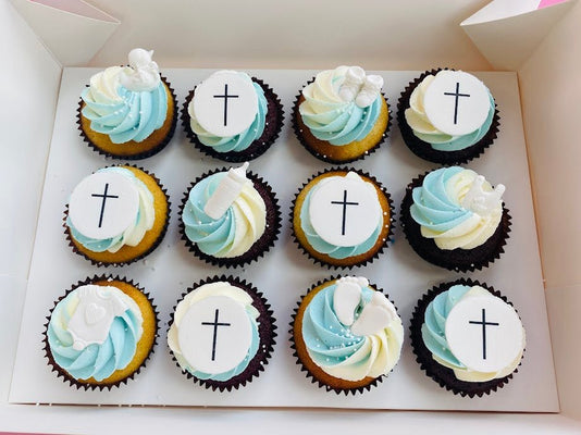 Each box includes a mix of our standard cupcake flavours, topped with half white and half coloured buttercream, and finished with elegant fondant decorations – including simple cross toppers on selected cupcakes.