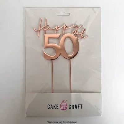 Celebrate 50 fabulous years with this elegant rose gold metal "Happy 50th" cake topper – a stunning addition to any milestone cake.