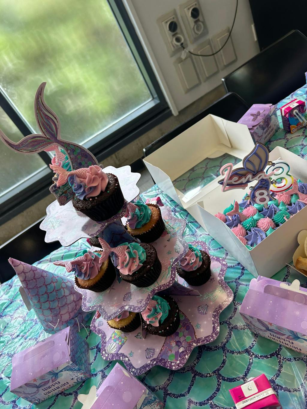 Each cupcake is beautifully decorated in turquoise, pink, and purple, topped with mermaid sprinkles and a chocolate mermaid tail – simply magical!