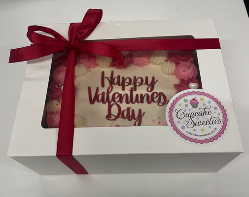 Our Valentine’s Day Cake in a Box is a decadent chocolate cake, topped with piped buttercream and finished with a “Happy Valentine’s Day” message — or a custom message of your choice 💌